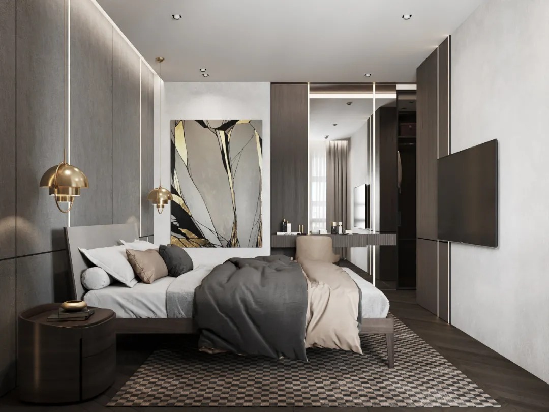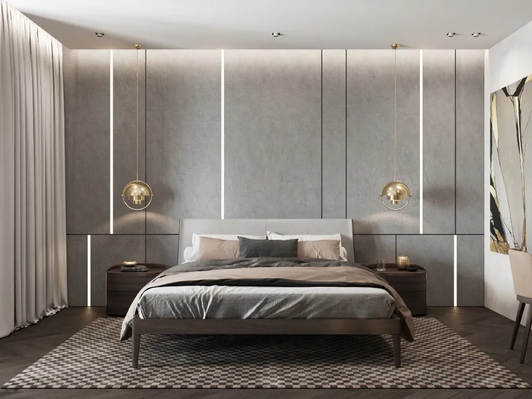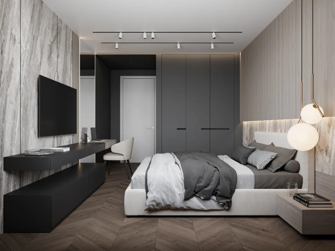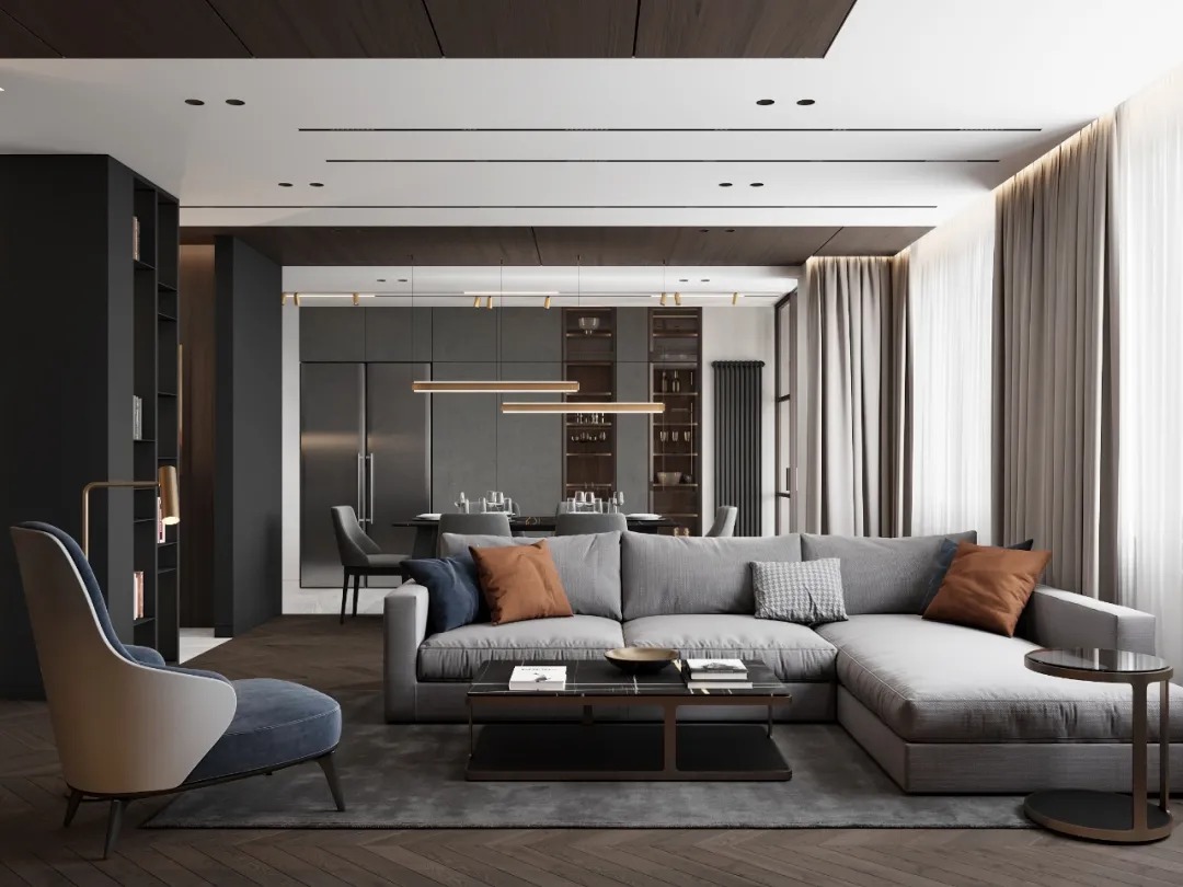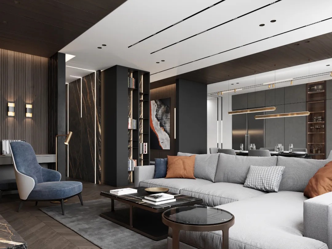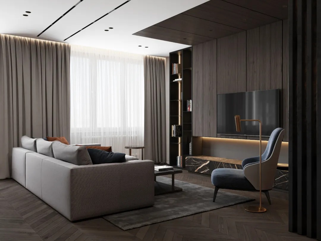 总面积为130平方米。室内以深灰、浅灰、蓝色穿插交错于整个空间,加入石材与胡桃木多重材质碰撞打造出沉静现代的魅力空间。空间部分灯饰采用藏于墙内的细长灯带,散发闪耀温暖的光线精致了空间的硬朗线条,让空间看起来有着不一样的奢华高级感。小小的阳台部分也被设计得高级舒适,简约不带一条多余的线条与装饰,全包式的玻璃窗引入充足的光线,木板从天花顶垂落的墙面,静谧惬意的感觉被呈现于阳台空间。
