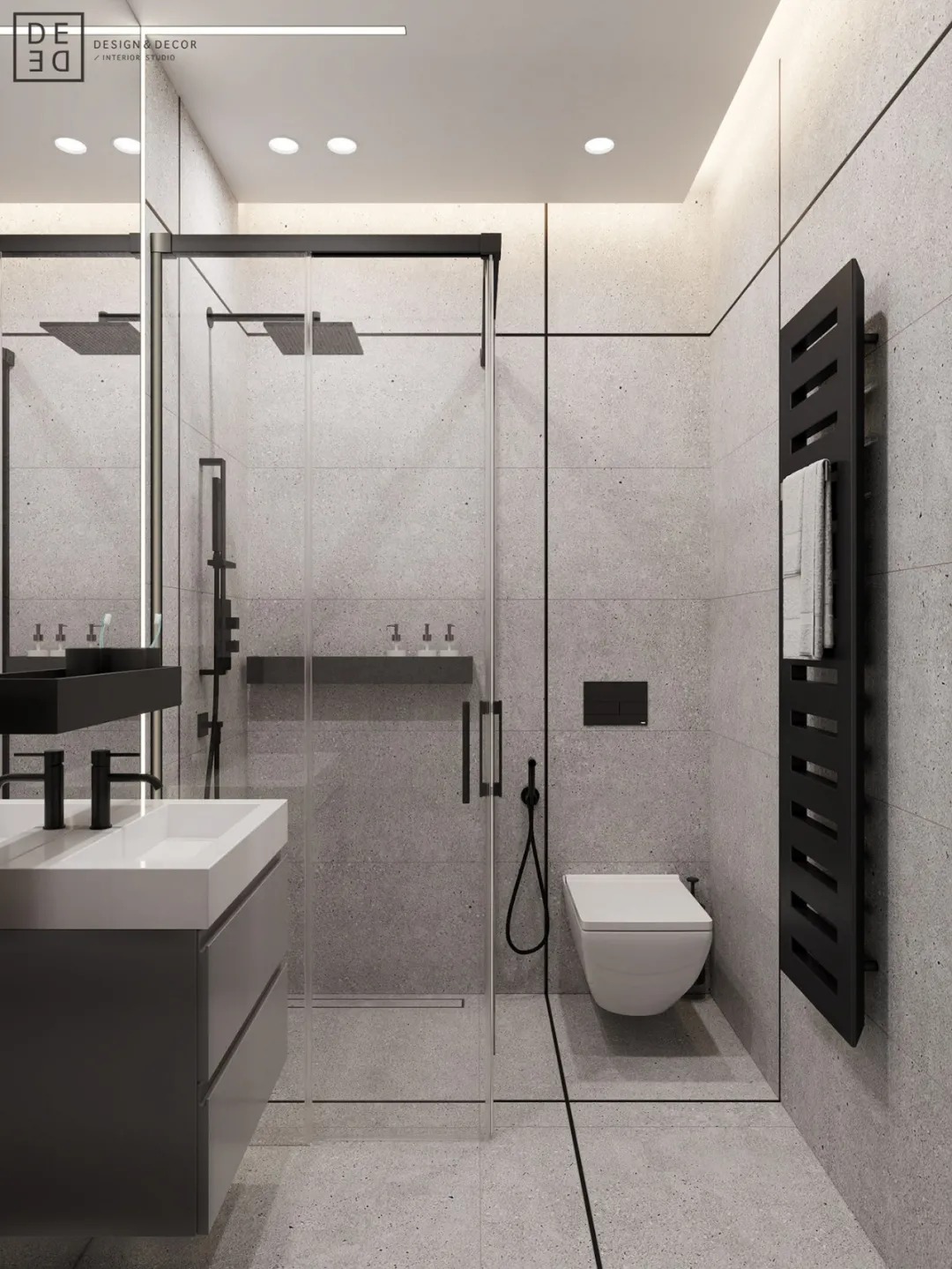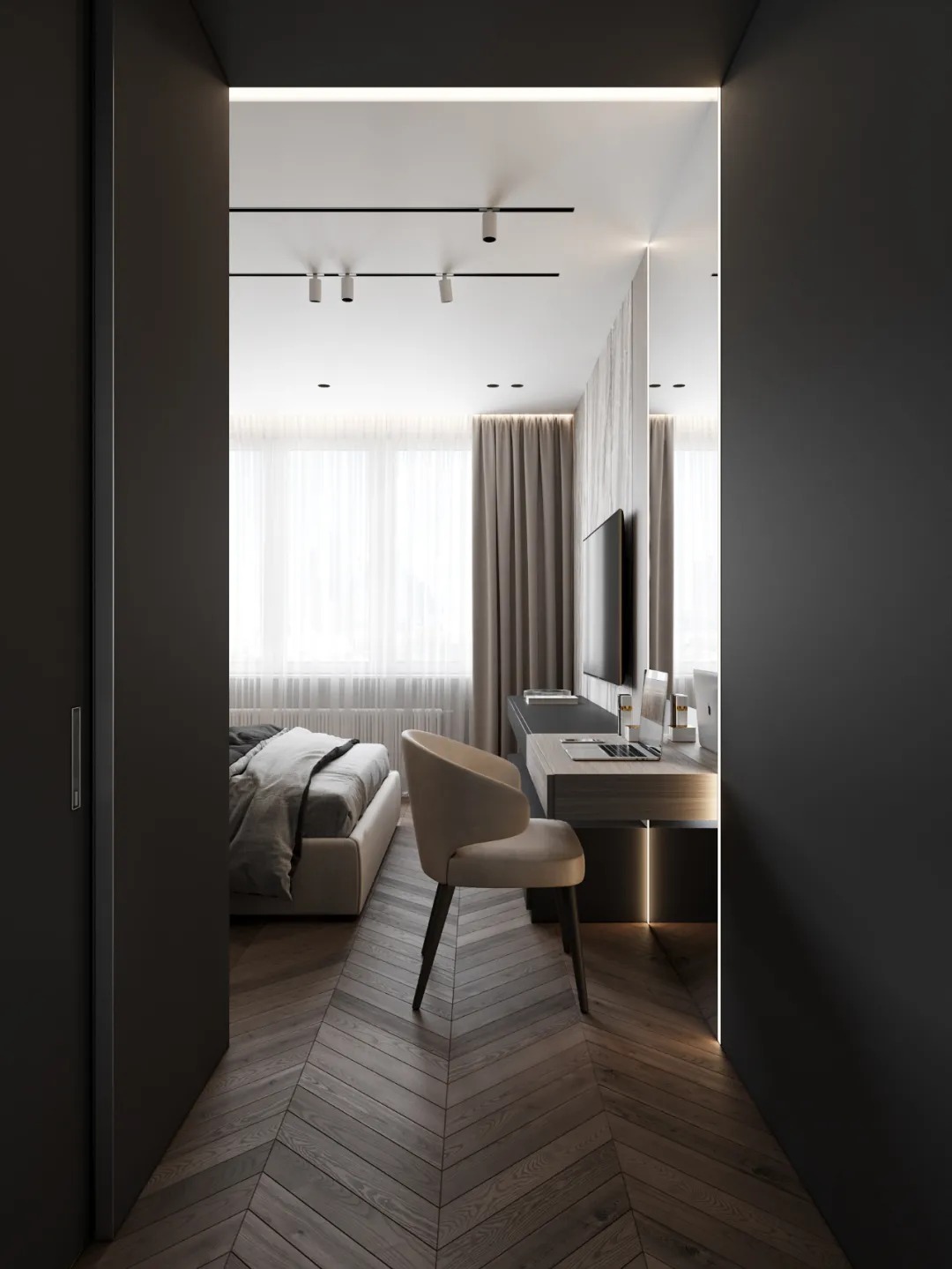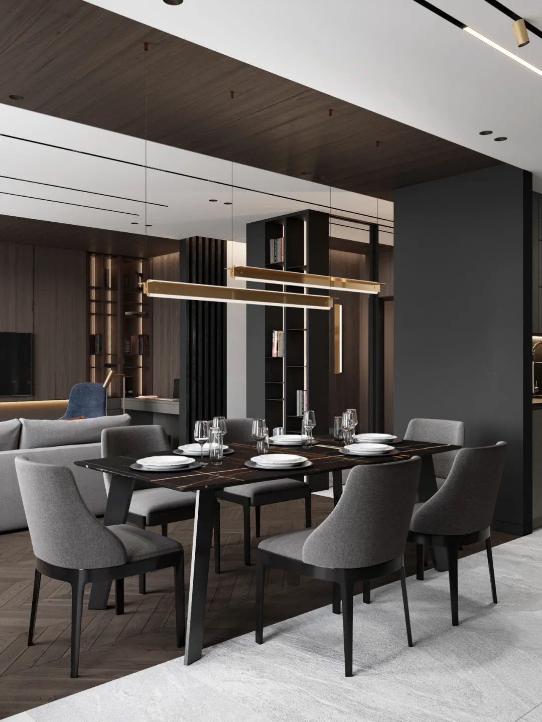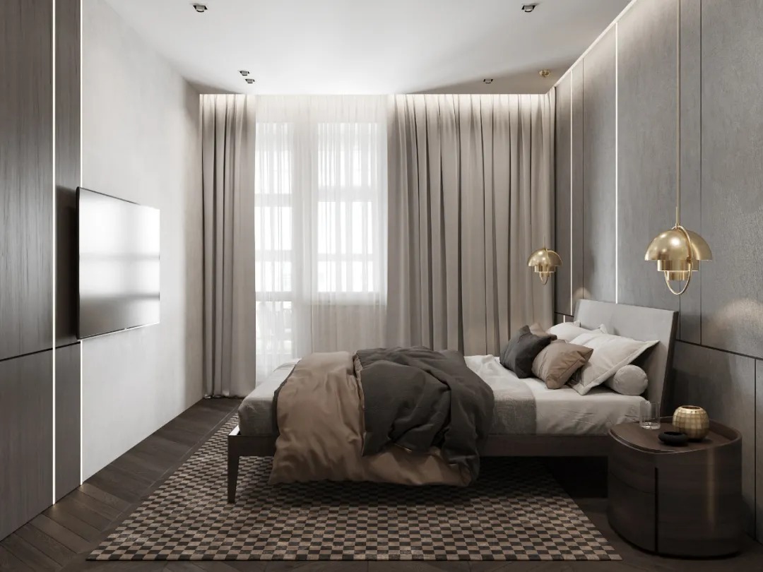 总面积为130平方米。室内以深灰、浅灰、蓝色穿插交错于整个空间,加入石材与胡桃木多重材质碰撞打造出沉静现代的魅力空间。空间部分灯饰采用藏于墙内的细长灯带,散发闪耀温暖的光线精致了空间的硬朗线条,让空间看起来有着不一样的奢华高级感。小小的阳台部分也被设计得高级舒适,简约不带一条多余的线条与装饰,全包式的玻璃窗引入充足的光线,木板从天花顶垂落的墙面,静谧惬意的感觉被呈现于阳台空间。