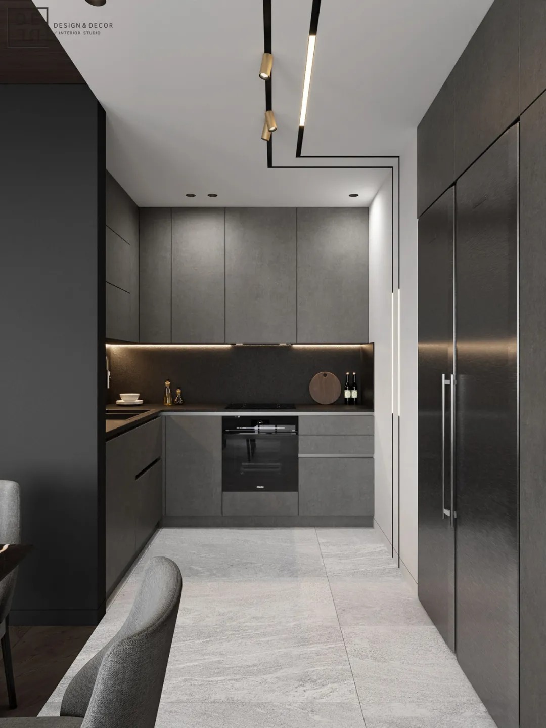 设计理念:总面积为130平方米。室内以深灰、浅灰、蓝色穿插交错于整个空间,加入石材与胡桃木多重材质碰撞打造出沉静现代的魅力空间。空间部分灯饰采用藏于墙内的细长灯带,散发闪耀温暖的光线精致了空间的硬朗线条,让空间看起来有着不一样的奢华高级感。小小的阳台部分也被设计得高级舒适,简约不带一条多余的线条与装饰,全包式的玻璃窗引入充足的光线,木板从天花顶垂落的墙面,静谧惬意的感觉被呈现于阳台空间。